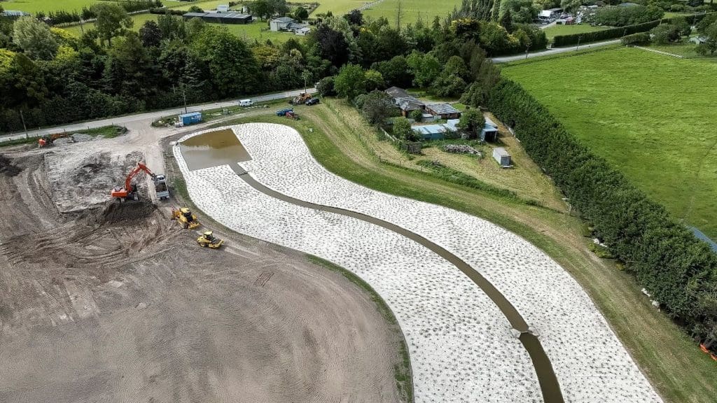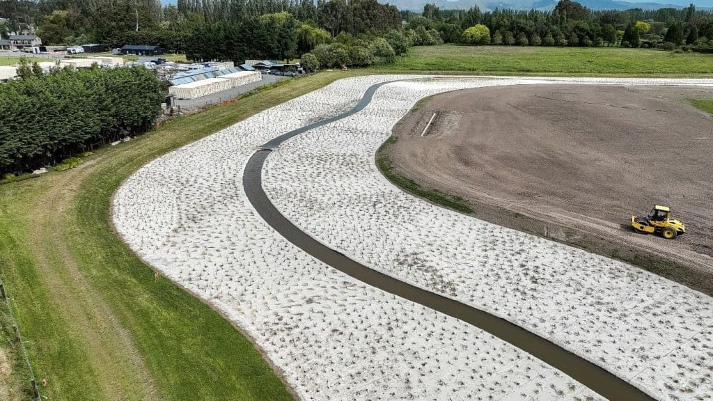 The design aligns with Water Sensitive Design and Te Mana o te Wai and is straightforward for project teams to deliver. To help the wetland plants establish and flourish, 18,000 sqm of DagMat 100% wool weed mat from Terra Lana was used in its creation.